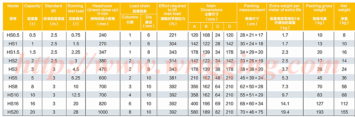 -With overload protection device(Optional).Specification and different capacities on HS Series hand Chain hoist: